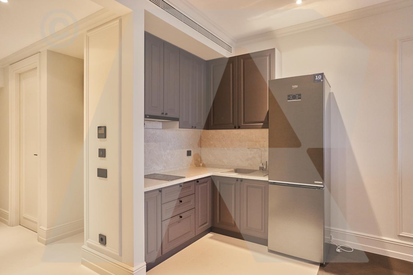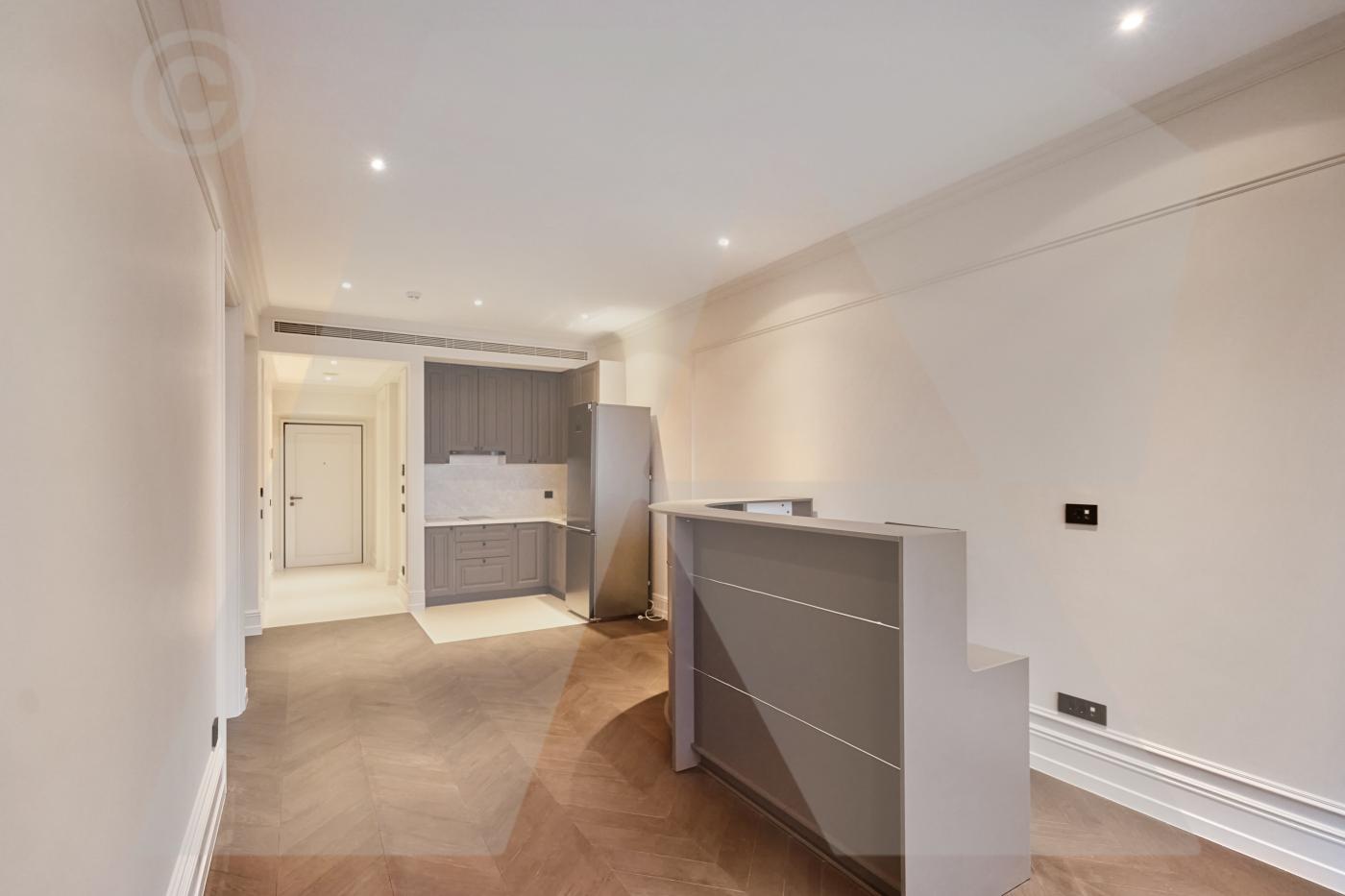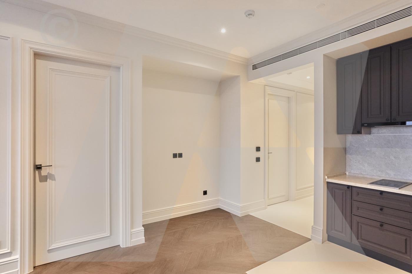 Апартамент без мебели. Установлена кухня и стойка ресепшен.