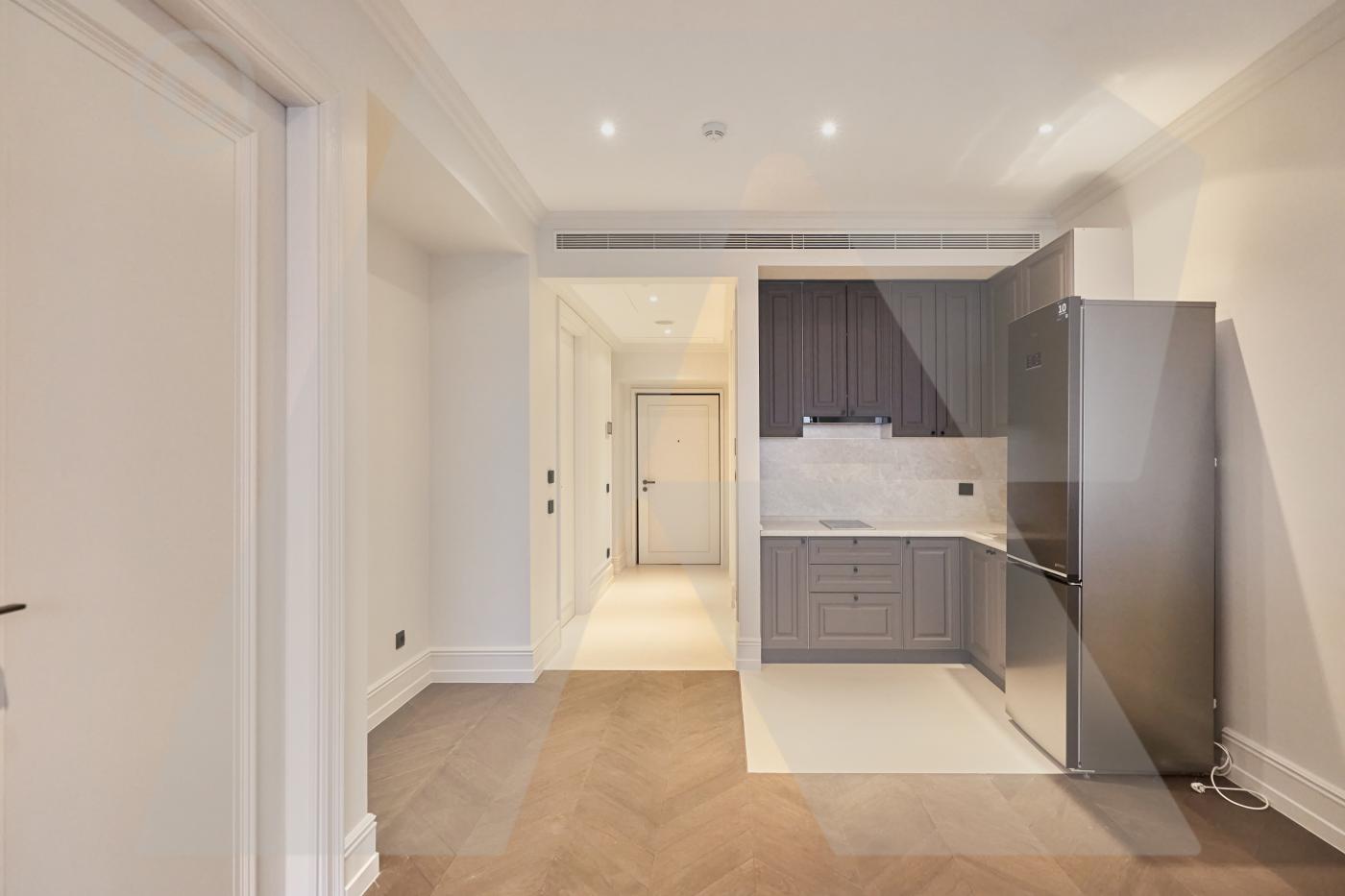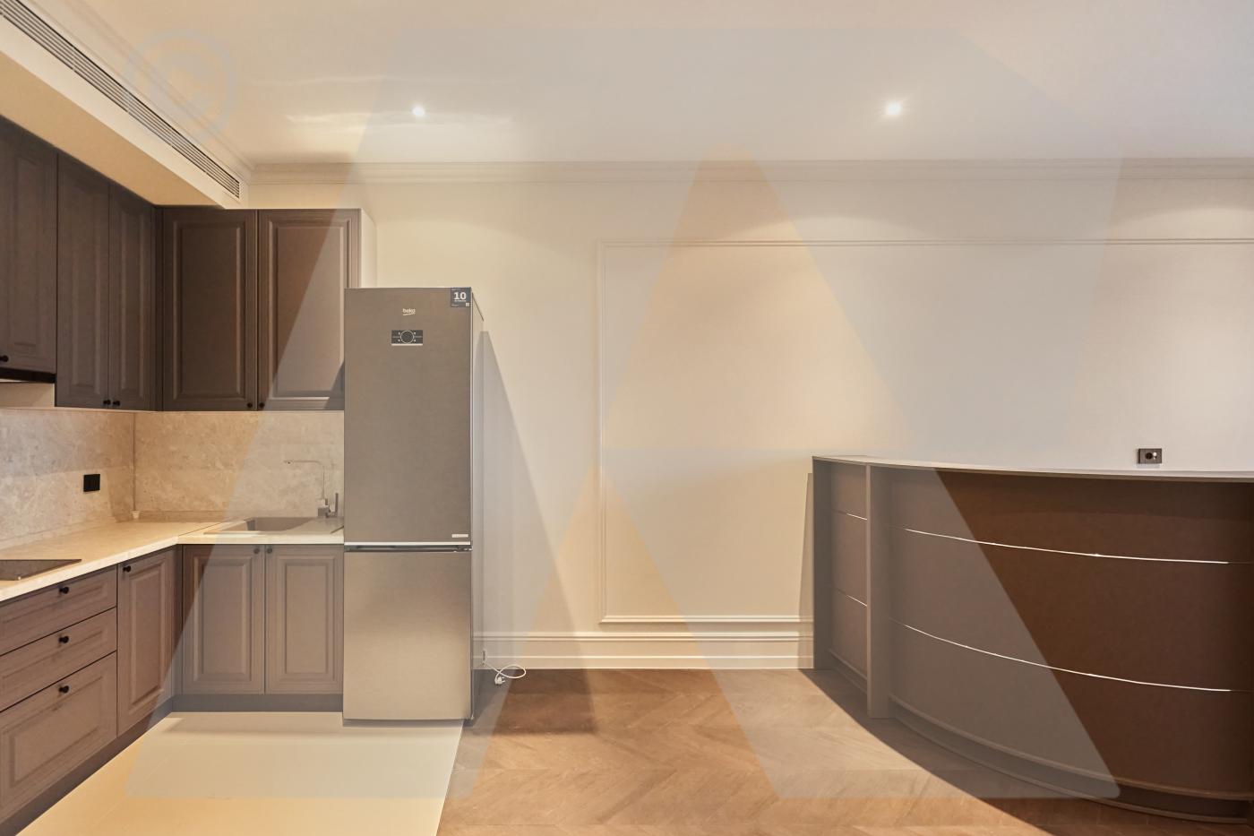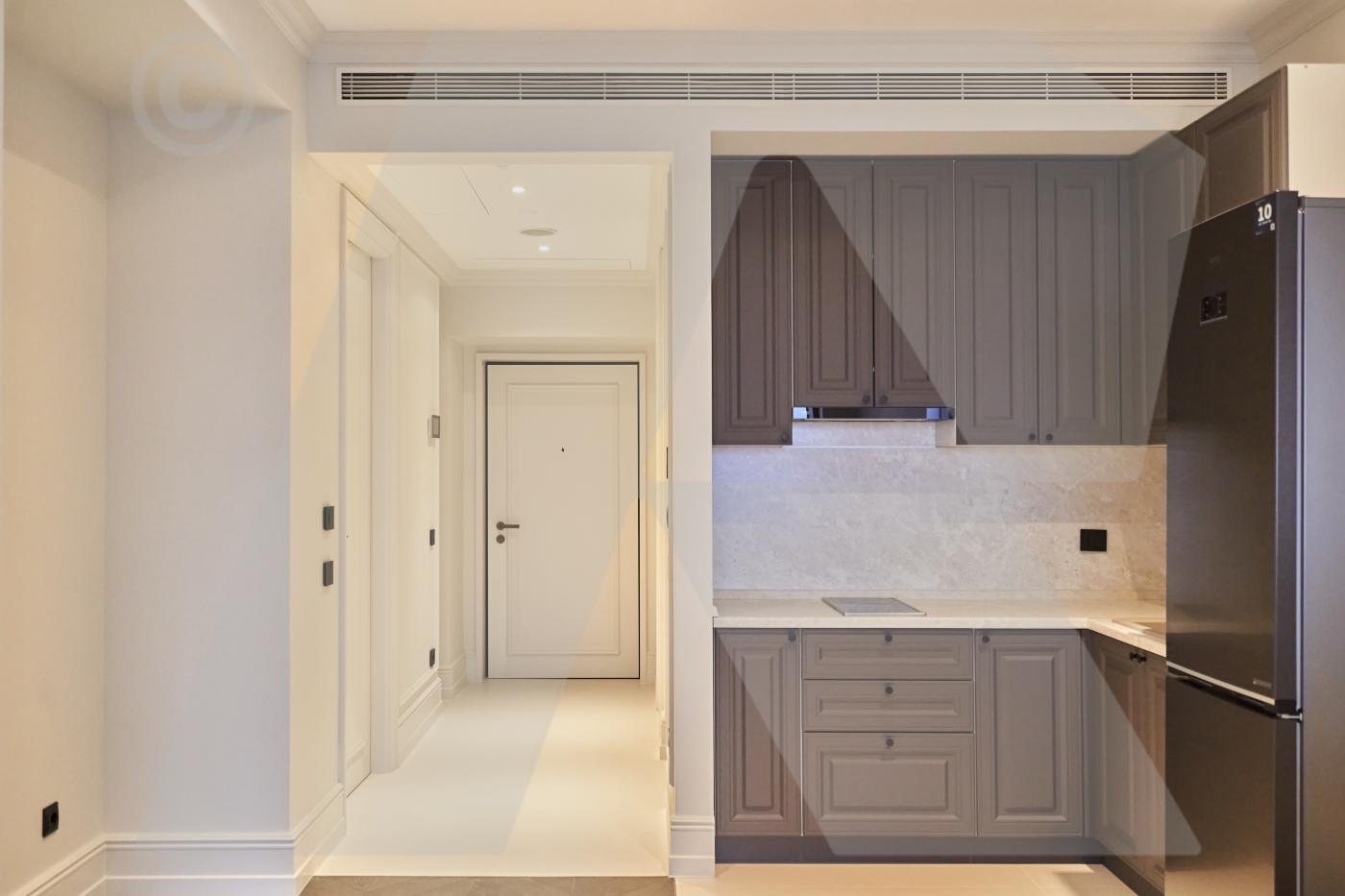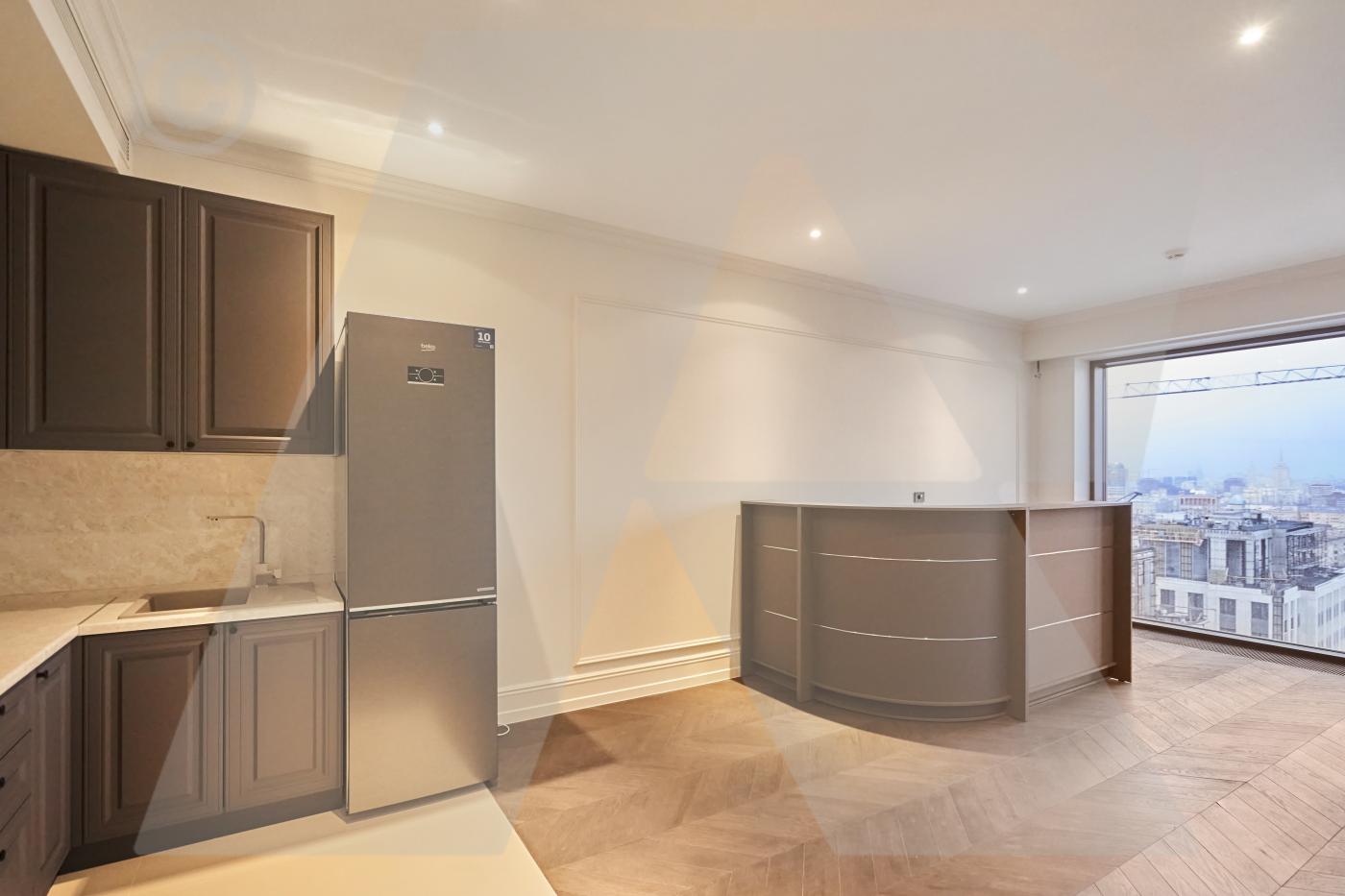 Апартамент без мебели. Установлена кухня и стойка ресепшен.